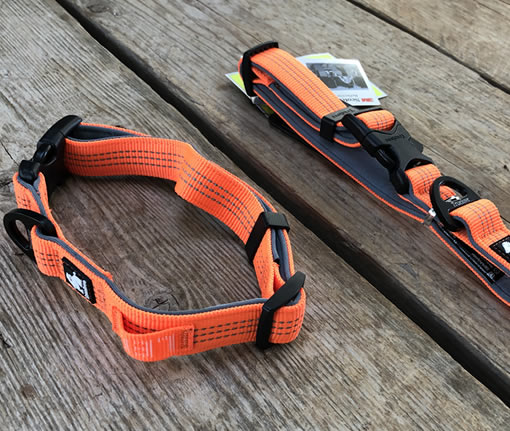 Diese Halsbänder für mitterlgroße Hunde sind gefüttert, verstellbar, reflektierend, stabil, mit original Duraflex-Verschluss, einem D-Ring aus schwarzem Aluminium und mit einer extra Schlaufe zur Befestigung einer LED-Lampe.